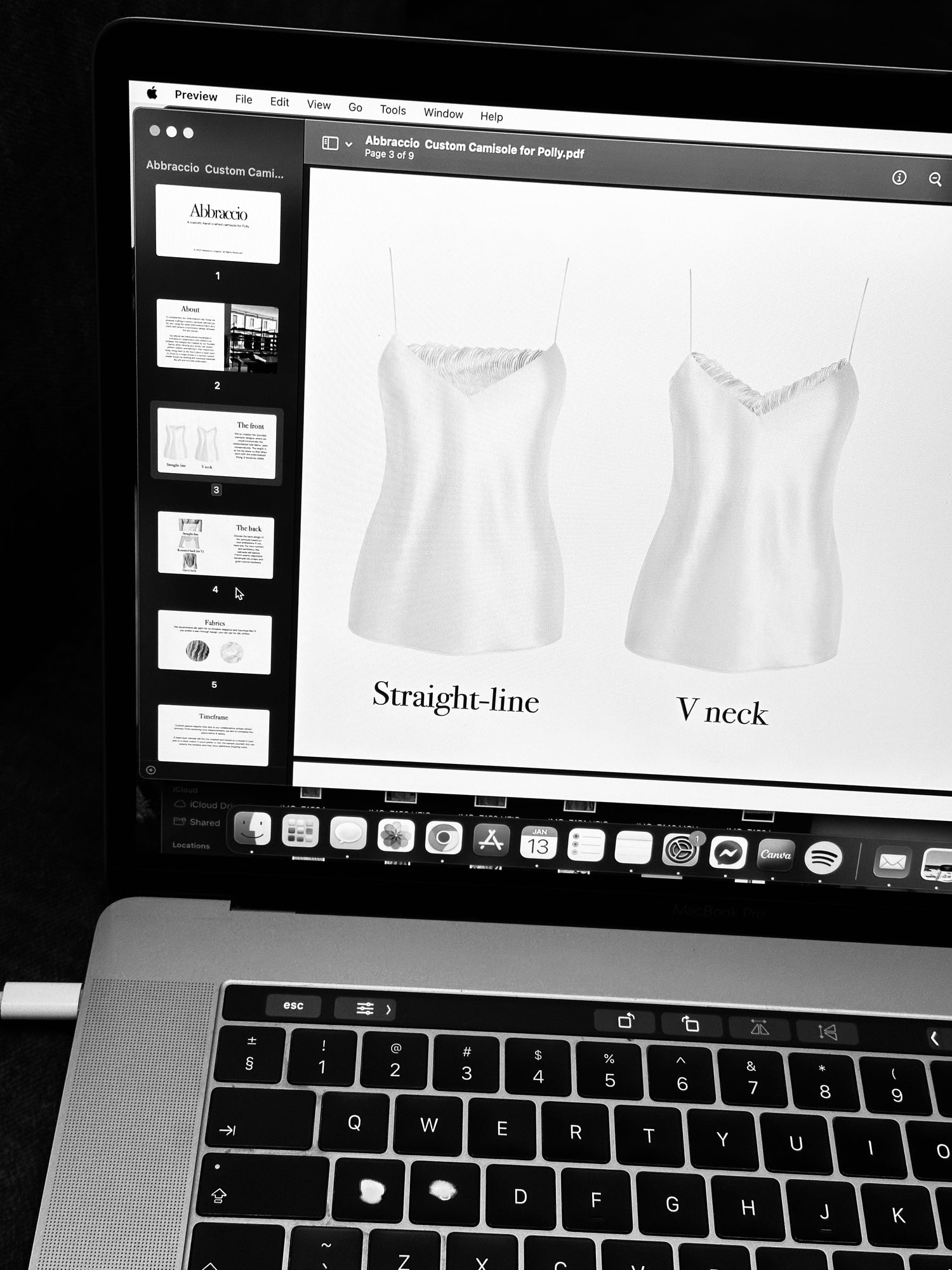 You receive a refined concept, fabric options, and all details regarding embellishments, lacework, and silhouette.